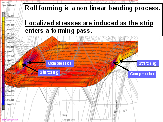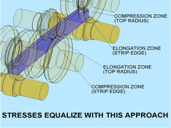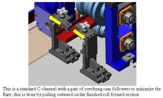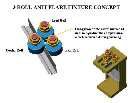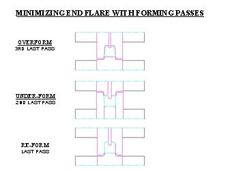 The designer takes end flare issues into consideration and designs the tooling to minimize the end flare. This is done by first over forming the section, and then under forming the section and finally finishing the section (see Figures 3 & 3A). This method works very well for most roll formed sections.
