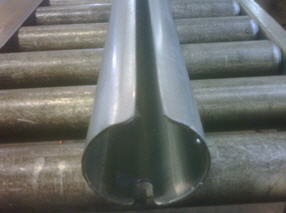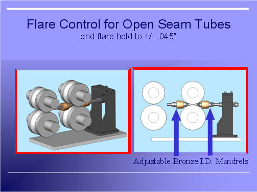 The next flare fixture is designed to minimize the end flare on open seam tubing; this conditioner has removed up to 0.375” flare on a pre-punched 0.090” thick tube. To control end flare the customer only had to adjust the vertical roll up or down depending on the dimension of the final profile.