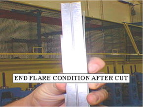 End flare in roll formed sections has been an issue since metal forming began. As metal is formed and transitions from one pass to the next, the strip is stretched and compressed to form a required profile. The ends deform whether it is a pre-cut section or cut off with a die. Usually one end will “flare-in” (close up) and the other end will “flare-out” (open up) as you can see in Figures 1 & 2.