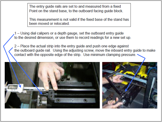 After documenting the position of the entry guide rails for a given strip, fabricate some sort of gauge blocks and etch the guide block positions, elevation and the strip width information onto one face (if possible).